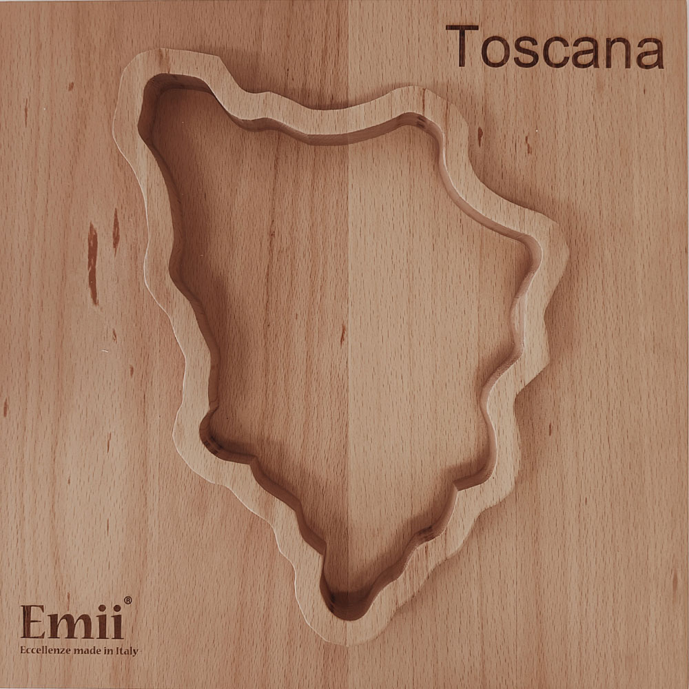 Tagliere tridimensionale a forma di Toscana utile per servire alimenti per aperitivi, pranzi o cene o come oggetto di design e idea regalo.